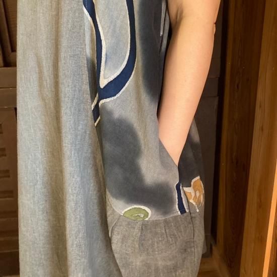 墨染の無地にろうけつ染めでメリハリのあるアクセントをつけギャザーや、丸みのあるラインにより大人可愛いわ演出。少し長めのチュニックは、軽め生地により、ストレスフリーに。ヴィンテージライクな風合いはこなれ感が漂います。