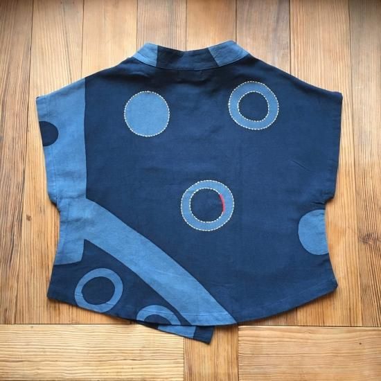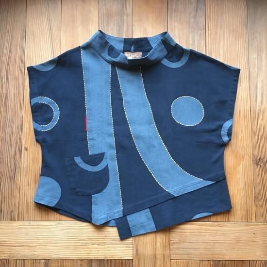 広めの首元に少し立ち上がった衿が、開きすぎずスッキリした印象をあたえてくれます。フレンチスリーブは、ブラウスとしてもベストとしても便利。ブルー系のろうけつ染に刺し子をほどこし、メリハリをつける事により粋な一着に仕上がりました。イレギュラーなヘムラインで、ボトムを選ばず楽しんでいただけます。